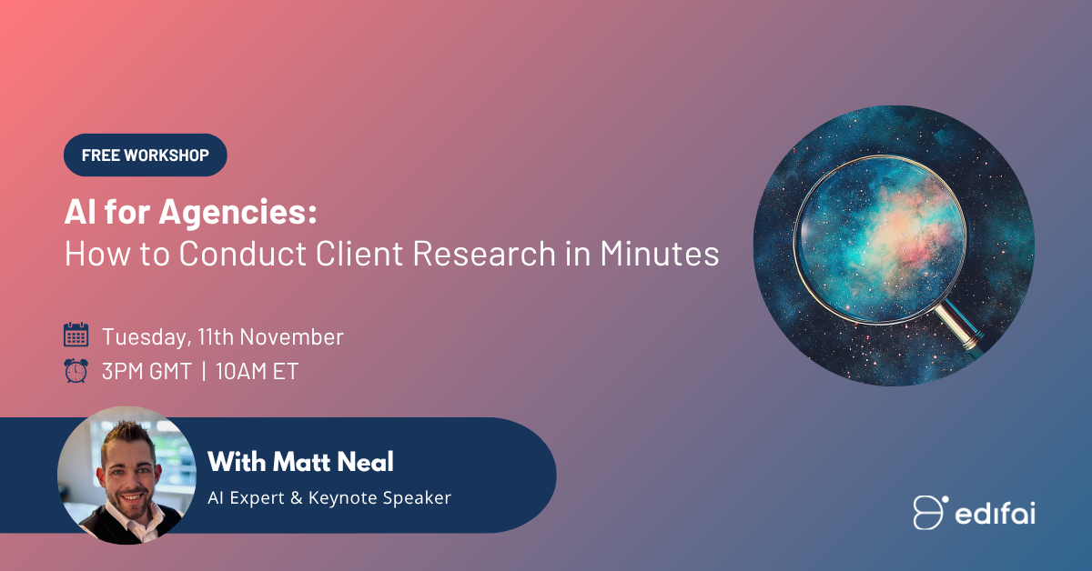 In this 30-minute workshop, AI Expert and Keynote Speaker Matt Neal will show creative and media agencies how to use ChatGPT to research both the company and the people behind the brief, helping you create a one-page client briefing report that sharpens your pitch.